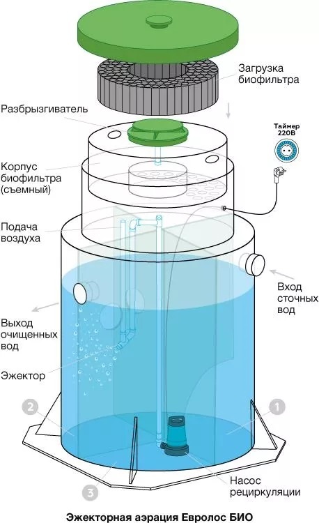 У станции Евролос Био более простой принцип работы. В основе его лежит механическое отстаивание загрязненной воды трех септических камерах. Наибольшее число загрязнений оседает в первой камере. В третьей вода уже достаточно осветленная и в ней стоит насос, который периодически включается, подает воду вверх и разбрызгивает ее на воздушный биофильтр, расположенный выше уровня стоков в верхней части станции. В этом фильтре стоки контактируют с биопленкой из микроорганизмов, несколько очищаются и насыщаются кислородом. После этого жидкость стекает с фильтра в первую приемную камеру, что способствует постепенной циркуляции стоков во всей установке и постепенной очистке этих стоков.