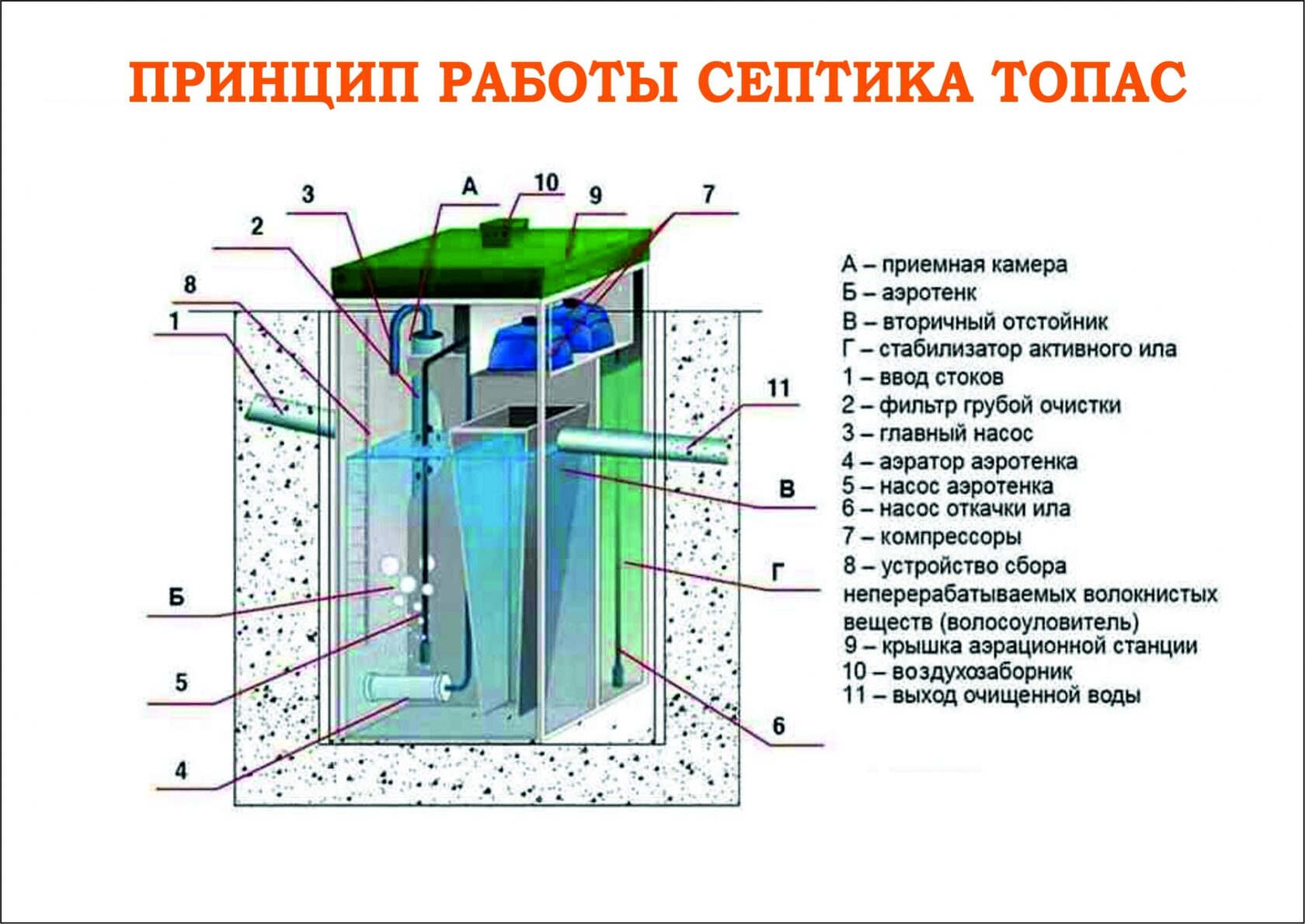 Автономная канализация Топас является системой, предназначенной для полной переработки всех бытовых стоков из дома — с туалета, кухни, душа, стиральной и посудомоечной машины. Это уменьшенная копия городских очистных сооружений. Она почти полностью перерабатывает и расщепляет все органическое отходы.
