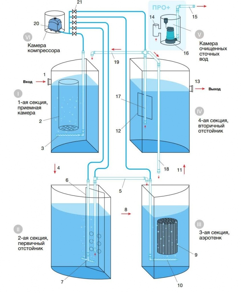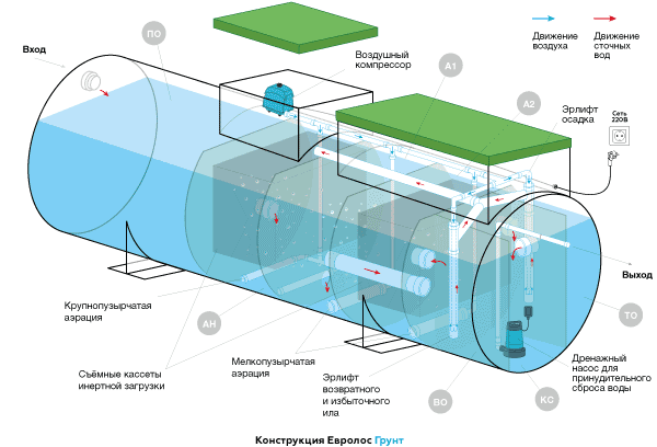 Основным рабочим элементом, так сказать, сердцем установки, являются компрессора. Они создают необходимое поступление кислорода в отсеки станции, а также нагнетают воздух в эрлифты для перекачки жидкости. Таким образом, бытовые стоки последовательно проходят зоны с аэрацией воздухом и зоны без аэрации. Благодаря этому происходит обработка аэробными и анаэробными бактериями, что дает высокую степень очистки.