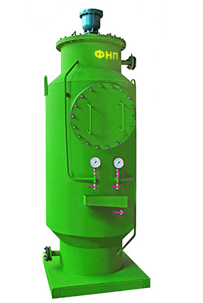 ФНП оборудован люком загрузки (верхний) и люком выгрузки (боковой) фильтрующего материала, а также распределительной системой со специальным дренажным устройством, размещенным в верхней и нижней его частях.