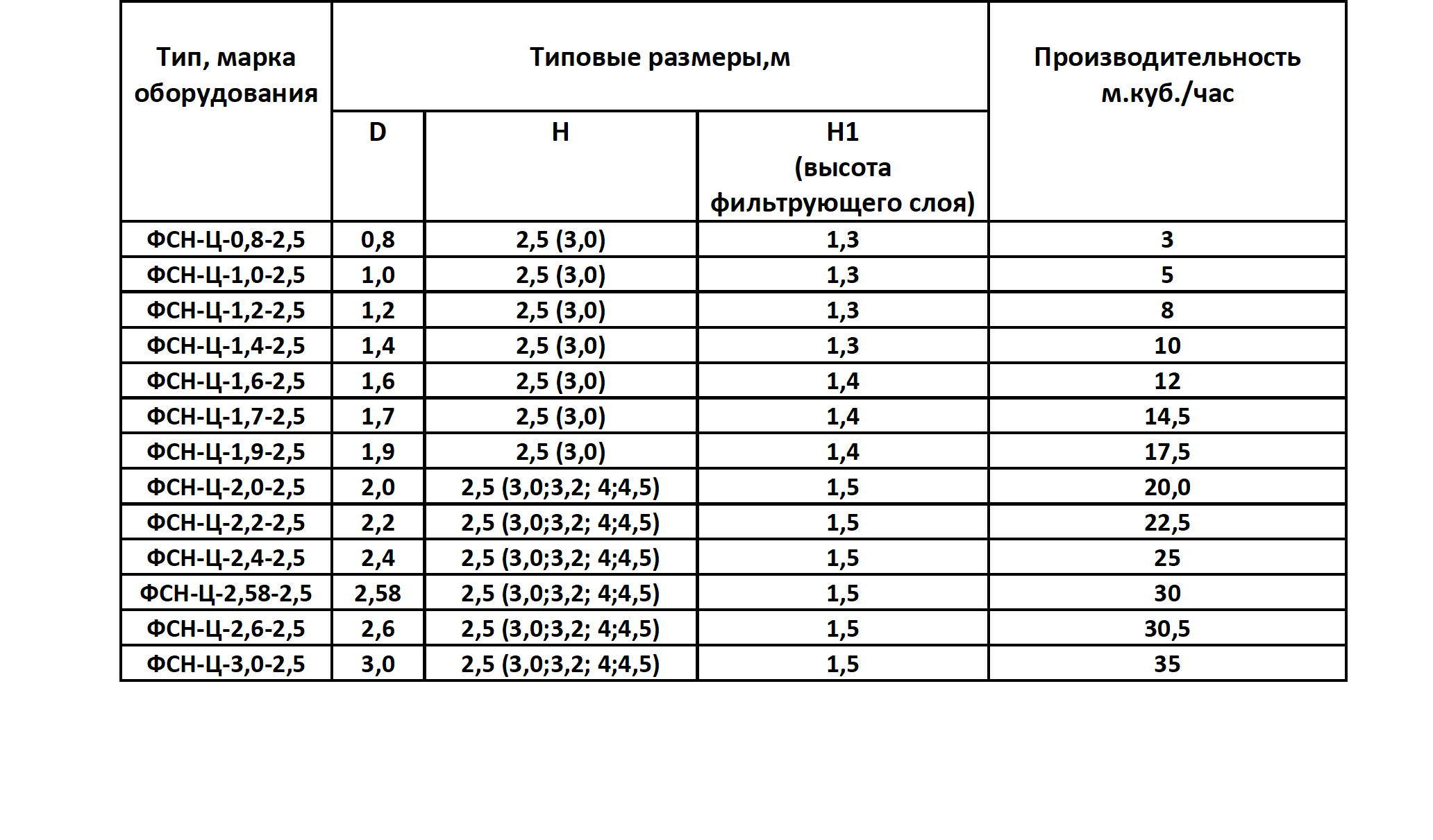 ФСНЦ выполнен в виде вертикального цилиндра, типовые размеры и высота которого указаны в приводимой таблице.